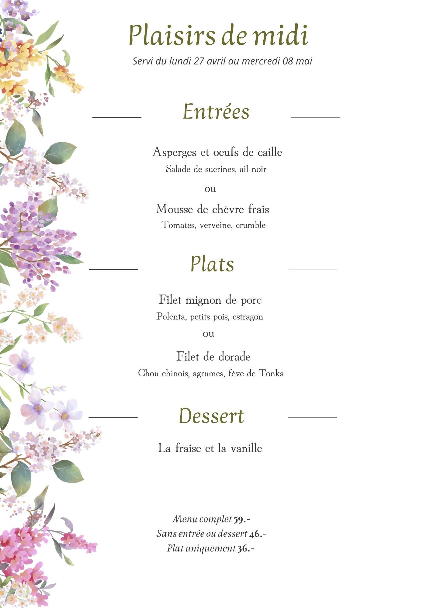 Menu disponible les lundis, mardis et mercredis midi