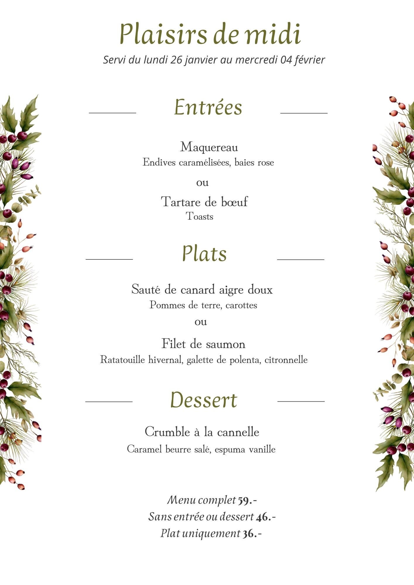 Menu disponible les soirs et le samedi midi jusqu'au samedi 07 mars